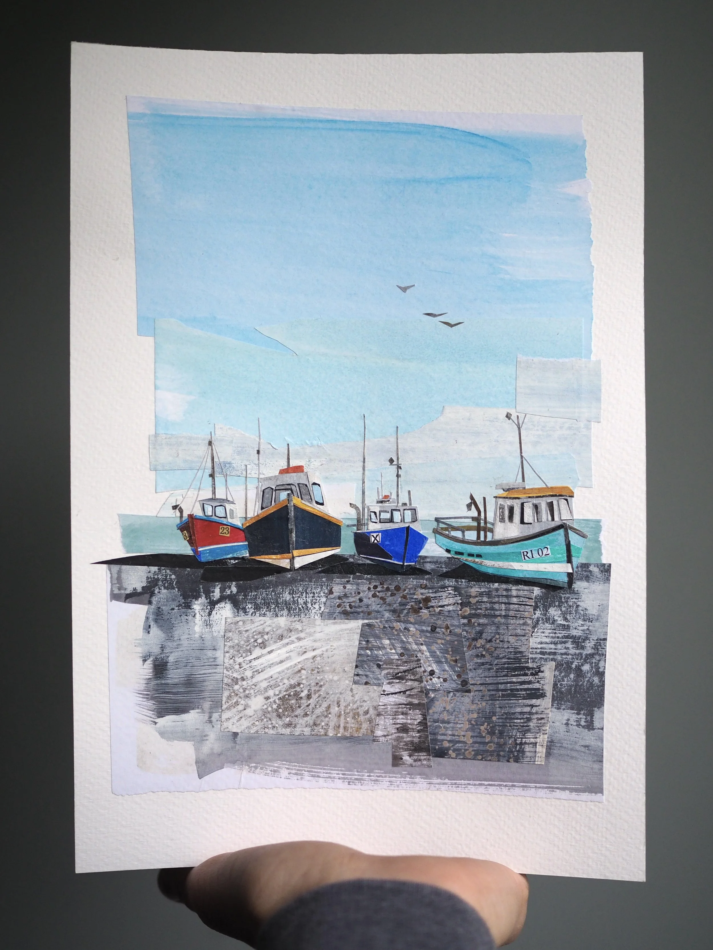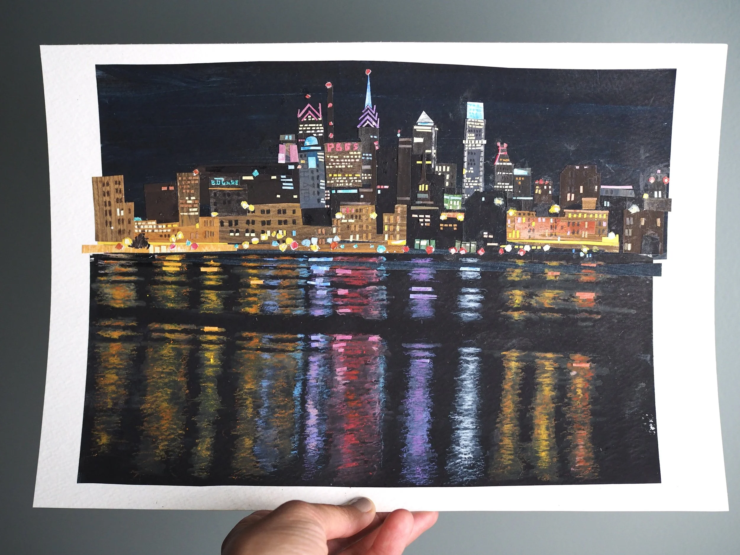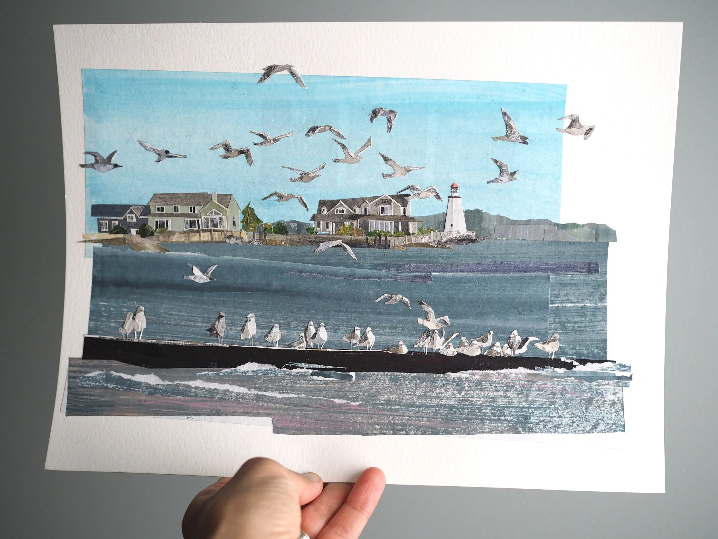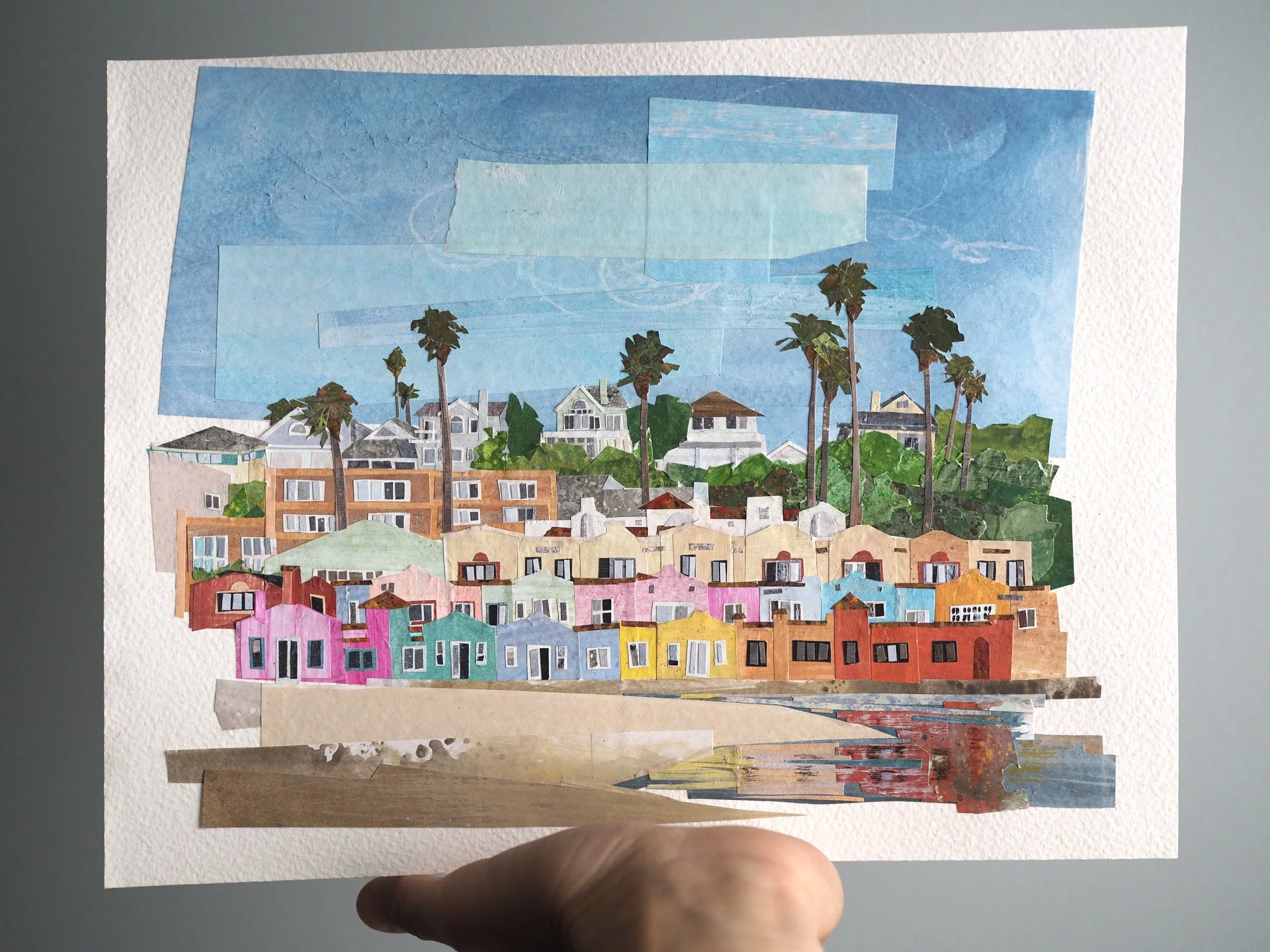 My work is made from recycled paper - usually junk mail or handouts my kids bring home from school - which I color and texture with gouache paint, along with touches of colored pencil and neocolor crayon. From this paper, I cut shapes and bits, arranging them into collage illustrations fixed either to paper or wood. Note: Most of my work purchased online comes unframed; wood pieces are the only exception. For framed work, please reach out to me directly or visit locations that carry my work:
