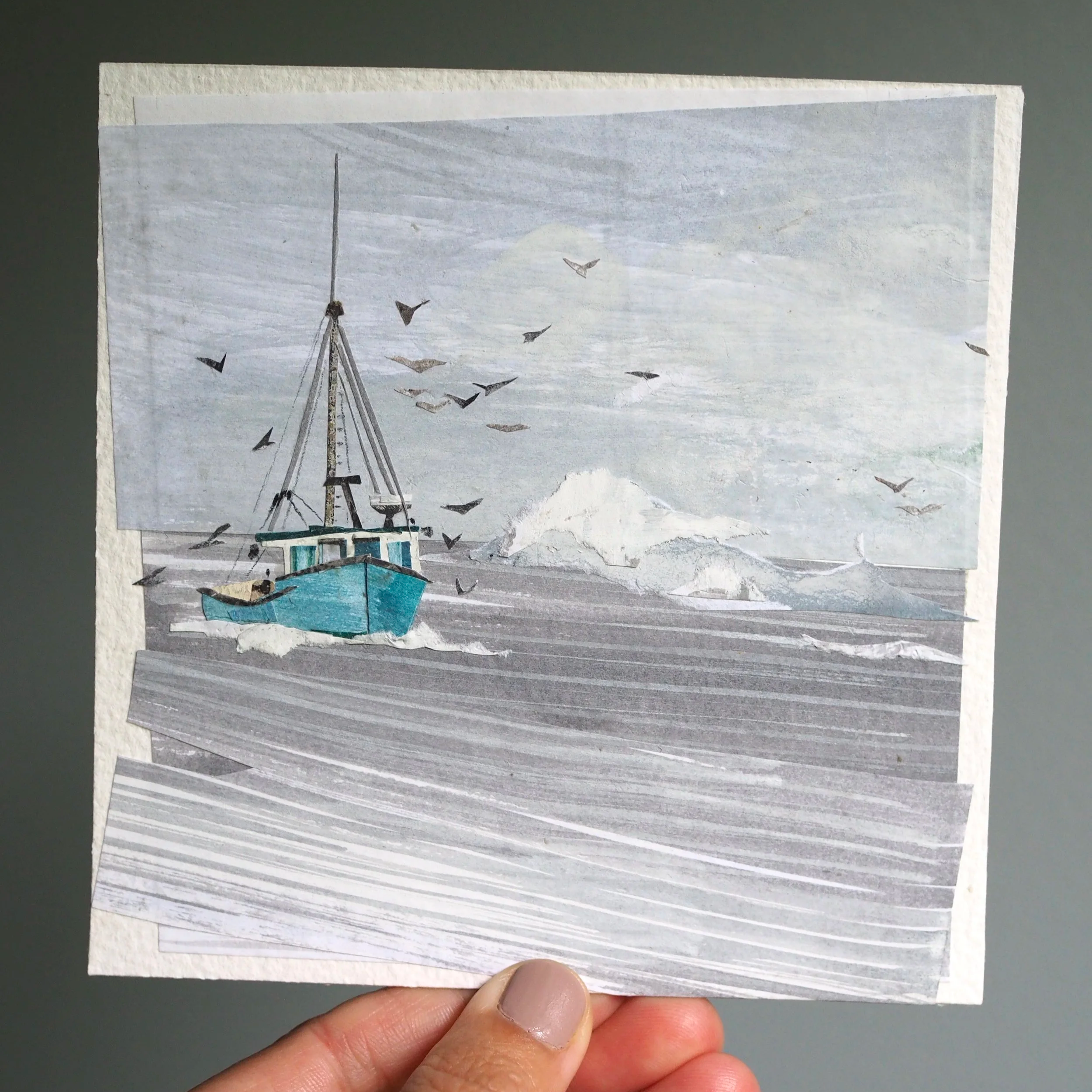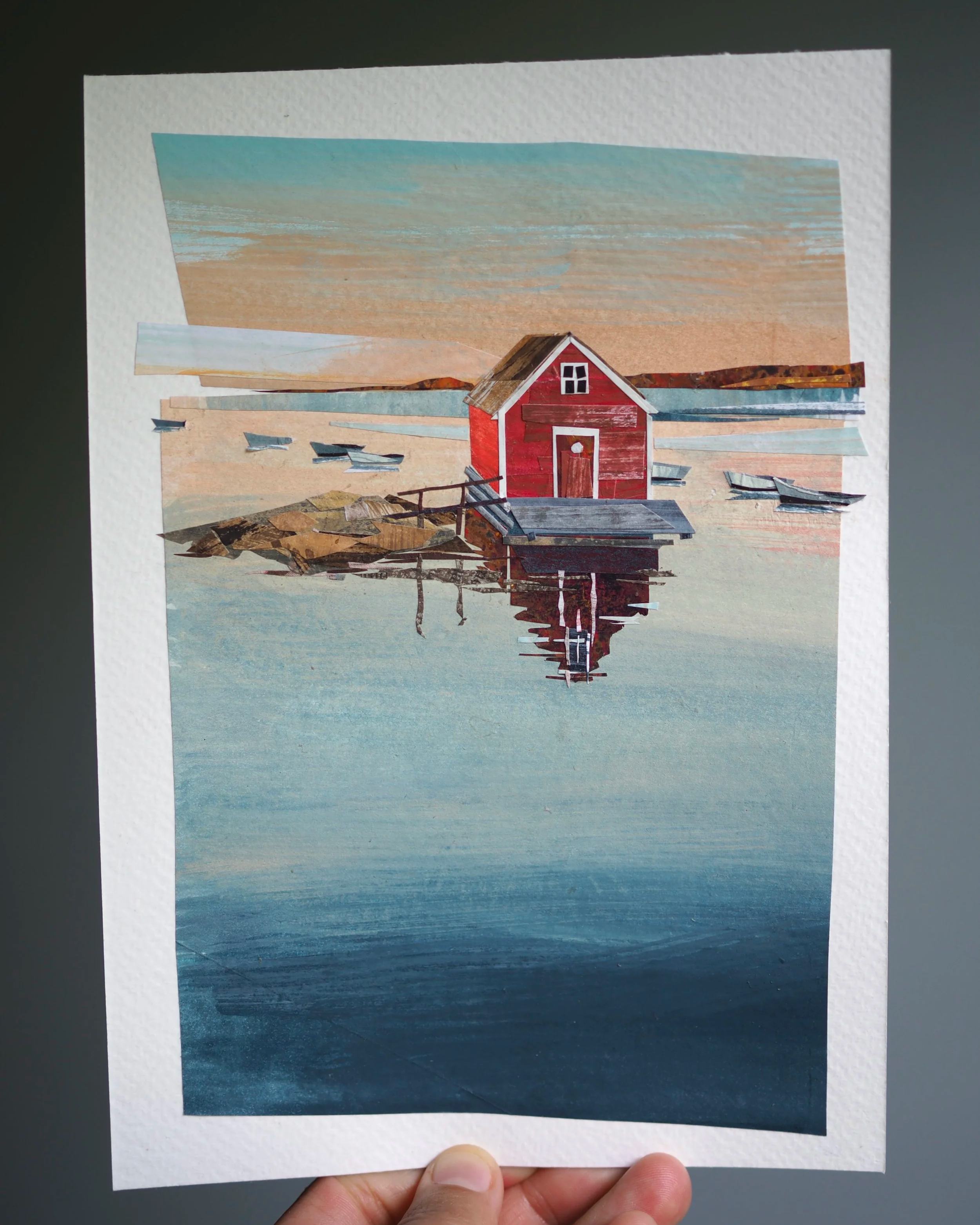 My work is made from recycled paper - usually junk mail or handouts my kids bring home from school - which I color and texture with gouache paint, along with touches of colored pencil and neocolor crayon. From this paper, I cut shapes and bits, arranging them into collage illustrations fixed either to paper or wood. Note: Most of my work purchased online comes unframed; wood pieces are the only exception. For framed work, please reach out to me directly or visit locations that carry my work: